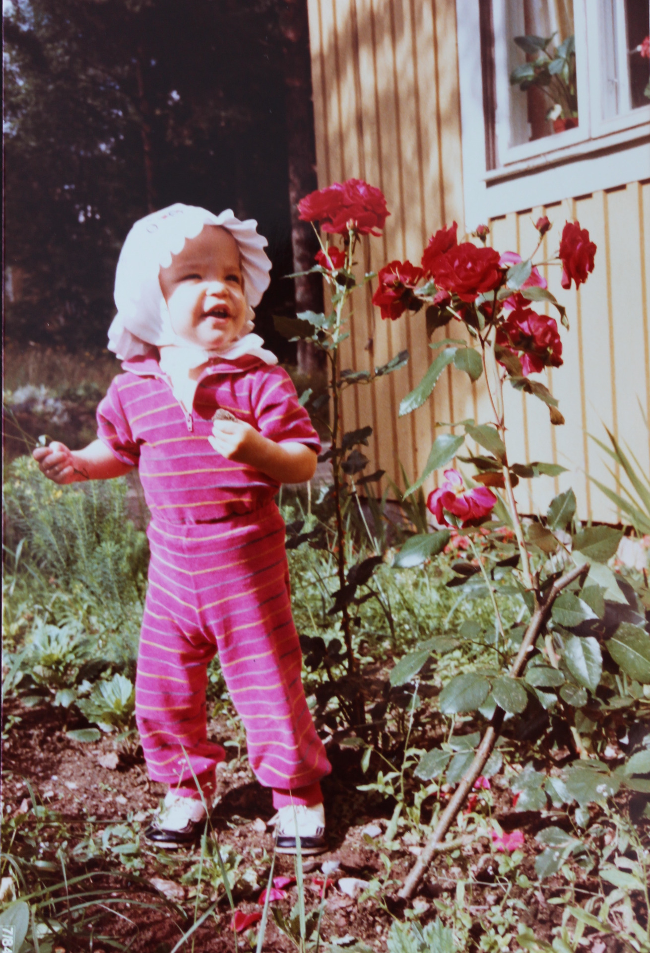 Tässä kuvassa olen 1-vuotias, pienempi kuin mummon ruusut ja aarteita kädet täynnä.